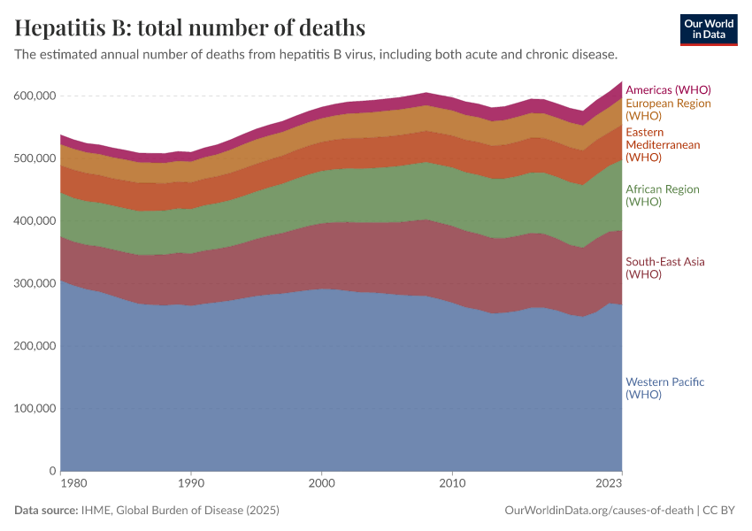 IHME, Global Burden of Disease (2024) – with minor processing by Our World in Data. “Hepatitis B: total number of deaths” [dataset]. IHME, Global Burden of Disease, “Global Burden of Disease - Deaths and DALYs” [original data]. Retrieved January 6, 2026 from https://sophia-test-2.owid.pages.dev/grapher/hepatitis-b-number-of-deaths