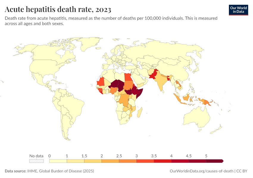 IHME, Global Burden of Disease (2024) – with minor processing by Our World in Data. “Acute hepatitis death rate” [dataset]. IHME, Global Burden of Disease, “Global Burden of Disease - Deaths and DALYs” [original data]. Retrieved January 6, 2026 from https://sophia-test-2.owid.pages.dev/grapher/hepatitis-death-rate