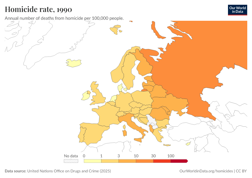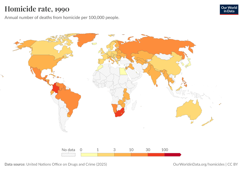 “Data Page: Homicide rate per 100,000 population”, part of the following publication: Bastian Herre, Fiona Spooner, and Max Roser (2013) - “Homicides”. Data adapted from United Nations Office on Drugs and Crime, United Nations, Various sources. Retrieved from https://sophia-test-2.owid.pages.dev/grapher/homicide-rate-unodc [online resource]How to cite this data