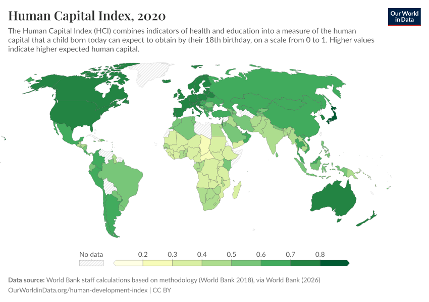 “Data Page: Human Capital Index”. Our World in Data (2026). Data adapted from World Bank staff calculations based on methodology (World Bank 2018), via World Bank. Retrieved from https://sophia-test-2.owid.pages.dev/grapher/human-capital-index-in-2018 [online resource]How to cite this data