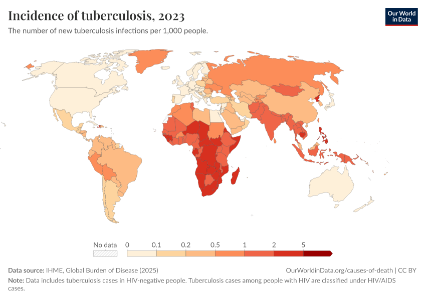 IHME, Global Burden of Disease (2024) – with major processing by Our World in Data. “Incidence of tuberculosis” [dataset]. IHME, Global Burden of Disease, “Global Burden of Disease - Prevalence and Incidence” [original data]. Retrieved January 6, 2026 from https://sophia-test-2.owid.pages.dev/grapher/incidence-of-tuberculosis