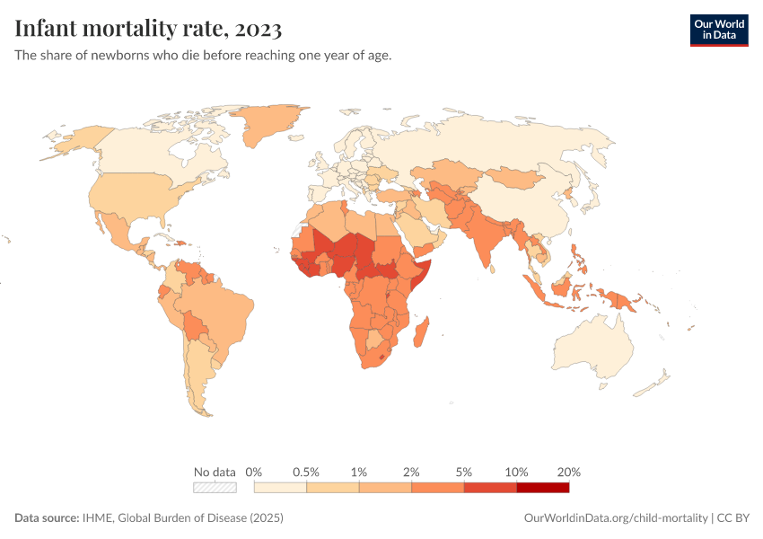 IHME, Global Burden of Disease (2024) – with minor processing by Our World in Data. “Infant mortality rate” [dataset]. IHME, Global Burden of Disease, “Global Burden of Disease - Child Mortality” [original data]. Retrieved January 6, 2026 from https://sophia-test-2.owid.pages.dev/grapher/infant-mortality-rate