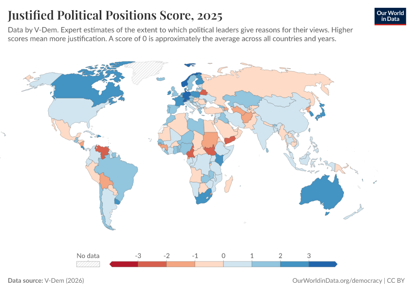 V-Dem (2025) – processed by Our World in Data. “Justified political positions – V-Dem” [dataset]. V-Dem, “Democracy report v15” [original data]. Retrieved January 6, 2026 from https://sophia-test-2.owid.pages.dev/grapher/justified-political-positions-score