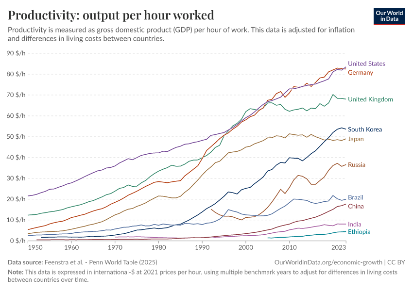 “Data Page: Productivity: output per hour worked”, part of the following publication: Max Roser, Bertha Rohenkohl, Pablo Arriagada, Joe Hasell, Hannah Ritchie, and Esteban Ortiz-Ospina (2023) - “Economic Growth”. Data adapted from Feenstra et al.. Retrieved from https://sophia-test-2.owid.pages.dev/grapher/labor-productivity-per-hour-pennworldtable [online resource]How to cite this data