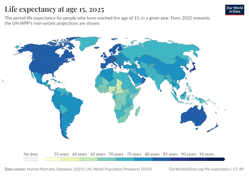 Human Mortality Database (2025); UN, World Population Prospects (2024) – with major processing by Our World in Data. “Life expectancy at 15 – HMD, UN WPP – period tables, with UN medium projections” [dataset]. Human Mortality Database, “Human Mortality Database”; United Nations, “World Population Prospects” [original data]. Retrieved January 6, 2026 from https://sophia-test-2.owid.pages.dev/grapher/life-expectancy-at-age-15