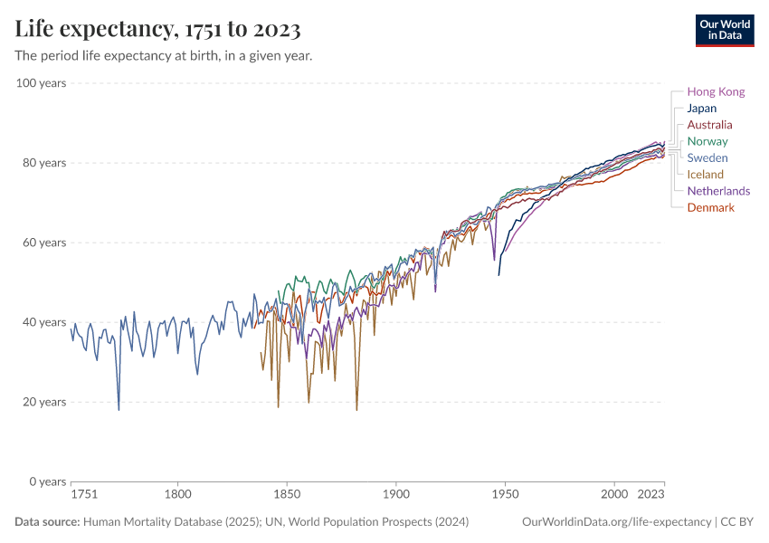 “Data Page: Life expectancy at birth”, part of the following publication: Saloni Dattani, Lucas Rodés-Guirao, Hannah Ritchie, Esteban Ortiz-Ospina, and Max Roser (2023) - “Life Expectancy”. Data adapted from Human Mortality Database, United Nations. Retrieved from https://sophia-test-2.owid.pages.dev/grapher/life-expectancy-hmd-unwpp [online resource]How to cite this data