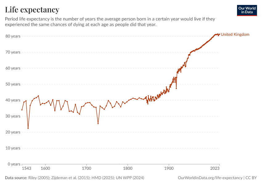 - This chart shows long-run estimates of life expectancy compiled by our team from several data sources. Before 1950, for country-level data, we rely on the Human Mortality Database (2025) combined with Zijdeman (2015). For regional data, we use Riley (2005). From 1950 onward, we use the United Nations World Population Prospects (2024).
