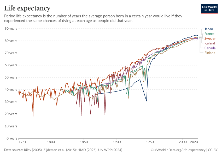 This chart combines data from several sources. For country-level data before 1950, we use the Human Mortality Database (2025) data and Zijdeman et al. (2015). For country-years where these sources overlap, we use the Human Mortality Database.