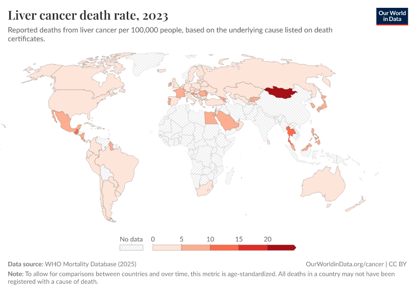 WHO Mortality Database (2025) – with minor processing by Our World in Data. “Liver cancer death rate” [dataset]. WHO Mortality Database, “WHO Mortality Database” [original data]. Retrieved January 6, 2026 from https://sophia-test-2.owid.pages.dev/grapher/liver-cancer-death-rate
