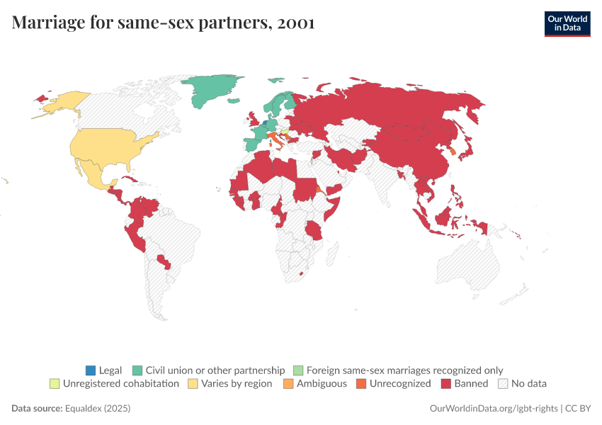 “Data Page: Marriage for same-sex partners”, part of the following publication: Bastian Herre and Pablo Arriagada (2023) - “LGBT+ Rights”. Data adapted from Equaldex. Retrieved from https://sophia-test-2.owid.pages.dev/grapher/marriage-same-sex-partners-equaldex [online resource]How to cite this data
