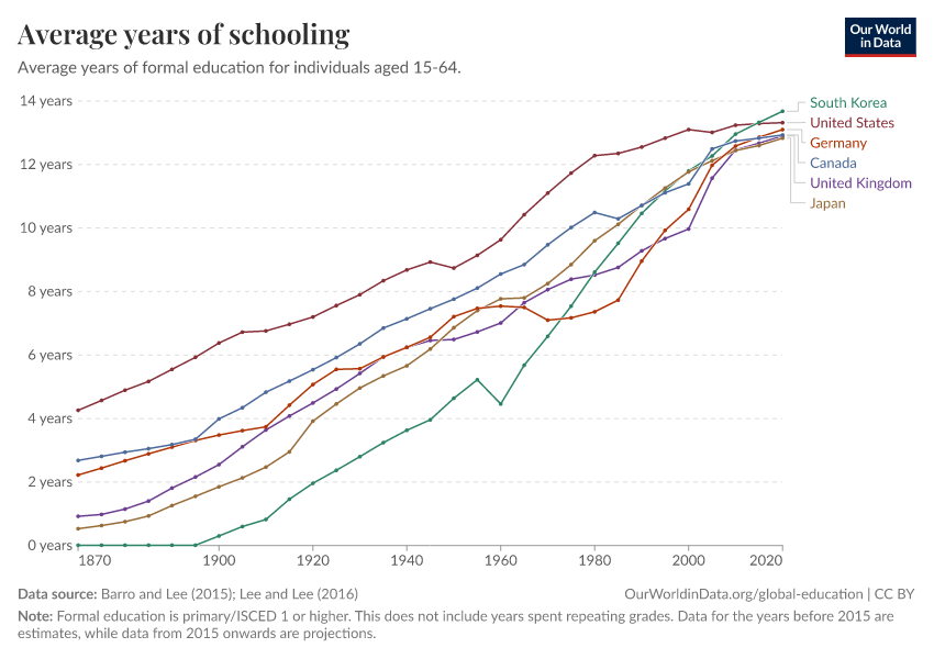 Barro and Lee (2015); Lee and Lee (2016) – with major processing by Our World in Data. “Average years of schooling” [dataset]. Barro and Lee, “Projections of Educational Attainment”; Lee and Lee, “Human Capital in the Long Run” [original data]. Retrieved January 6, 2026 from https://sophia-test-2.owid.pages.dev/grapher/mean-years-of-schooling-long-run