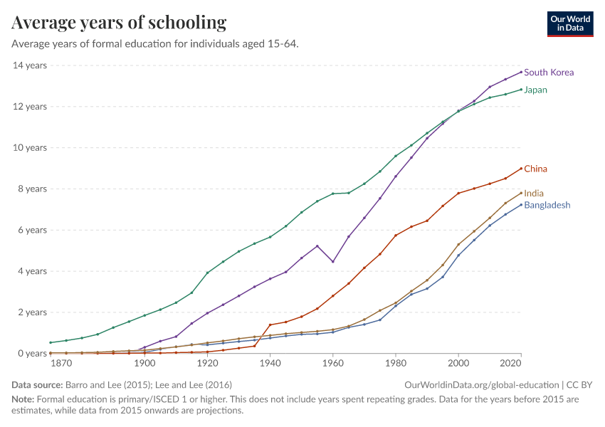 Barro and Lee (2015); Lee and Lee (2016) – with major processing by Our World in Data. “Average years of schooling” [dataset]. Barro and Lee, “Projections of Educational Attainment”; Lee and Lee, “Human Capital in the Long Run” [original data]. Retrieved January 6, 2026 from https://sophia-test-2.owid.pages.dev/grapher/mean-years-of-schooling-long-run