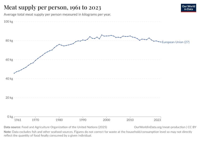 Food and Agriculture Organization of the United Nations (2024) – processed by Our World in Data. “Yearly per capita supply of all meat” [dataset]. Food and Agriculture Organization of the United Nations, “Food Balances: Food Balances (-2013, old methodology and population)”; Food and Agriculture Organization of the United Nations, “Food Balances: Food Balances (2010-)” [original data]. Retrieved January 6, 2026 from https://sophia-test-2.owid.pages.dev/grapher/meat-supply-per-person