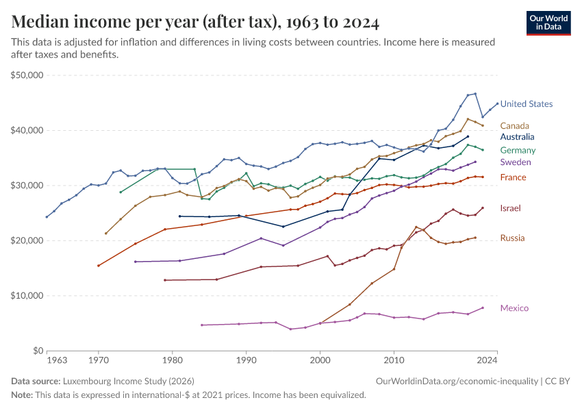 “Data Page: Median income per year (after tax)”, part of the following publication: Joe Hasell, Bertha Rohenkohl, Pablo Arriagada, Esteban Ortiz-Ospina, and Max Roser (2022) - “Poverty”. Data adapted from Luxembourg Income Study. Retrieved from https://sophia-test-2.owid.pages.dev/grapher/median-income-after-tax-lis [online resource]How to cite this data