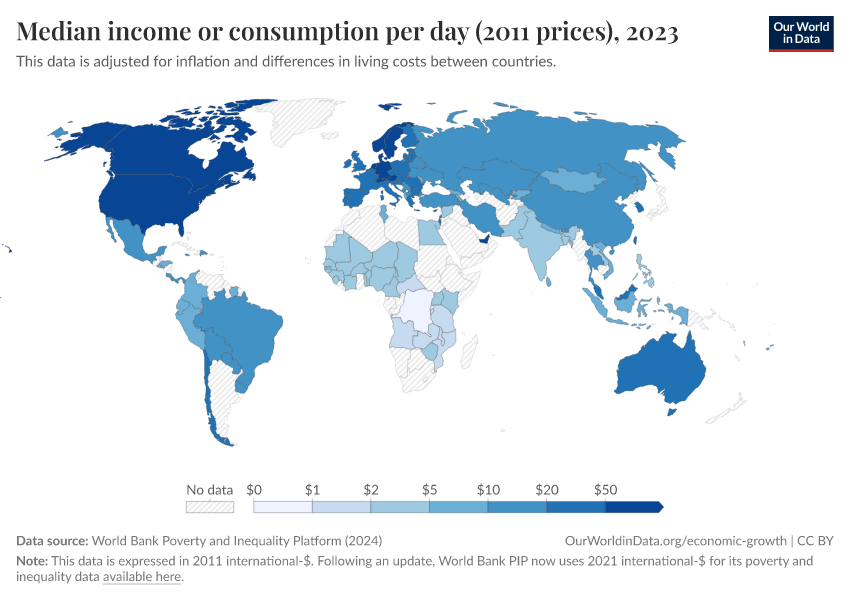 “Data Page: Median income or consumption per day (2011 prices)”, part of the following publication: Joe Hasell, Bertha Rohenkohl, Pablo Arriagada, Esteban Ortiz-Ospina, and Max Roser (2022) - “Poverty”. Data adapted from World Bank Poverty and Inequality Platform. Retrieved from https://sophia-test-2.owid.pages.dev/grapher/median-income-or-consumption-per-day-2011-prices [online resource]How to cite this data