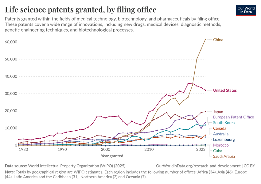 “Data Page: Life science patents granted, by filing office”. Our World in Data (2026). Data adapted from World Intellectual Property Organization (WIPO). Retrieved from https://sophia-test-2.owid.pages.dev/grapher/medicine-and-biotechnology-patents-granted-by-filing-office [online resource]How to cite this data
