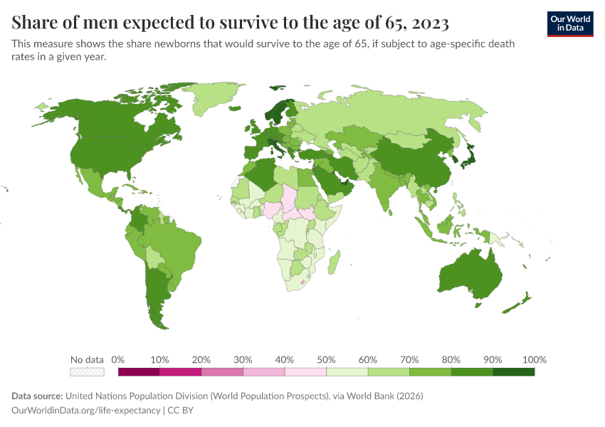 “Data Page: Share of men expected to survive to the age of 65”. Our World in Data (2026). Data adapted from United Nations Population Division (World Population Prospects), via World Bank. Retrieved from https://sophia-test-2.owid.pages.dev/grapher/men-survival-to-age-65 [online resource]How to cite this data