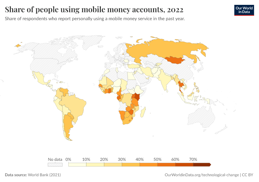 “Data Page: Share of people using mobile money accounts”, part of the following publication: Max Roser, Bertha Rohenkohl, Pablo Arriagada, Joe Hasell, Hannah Ritchie, and Esteban Ortiz-Ospina (2023) - “Economic Growth”. Data adapted from World Bank. Retrieved from https://sophia-test-2.owid.pages.dev/grapher/mobile-money-account-usage [online resource]How to cite this data