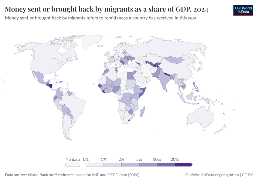 “Data Page: Money sent or brought back by migrants as a share of GDP”. Our World in Data (2026). Data adapted from World Bank staff estimates based on IMF and OECD data. Retrieved from https://sophia-test-2.owid.pages.dev/grapher/money-sent-or-brought-back-by-migrants-as-a-share-of-gdp [online resource]