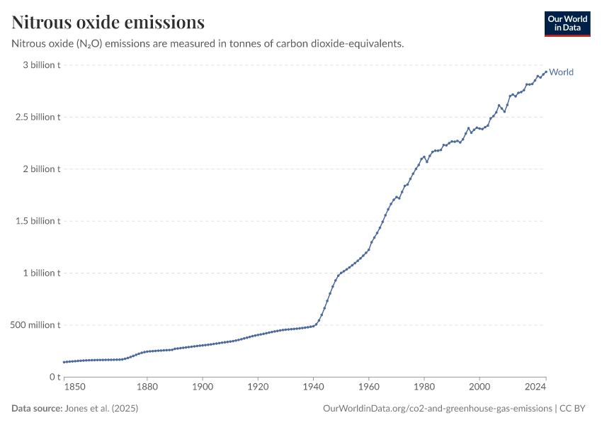 Jones et al. (2025) – with major processing by Our World in Data. “Annual nitrous oxide emissions including land use” [dataset]. Jones et al., “National contributions to climate change 2025.1” [original data]. Retrieved January 6, 2026 from https://sophia-test-2.owid.pages.dev/grapher/nitrous-oxide-emissions