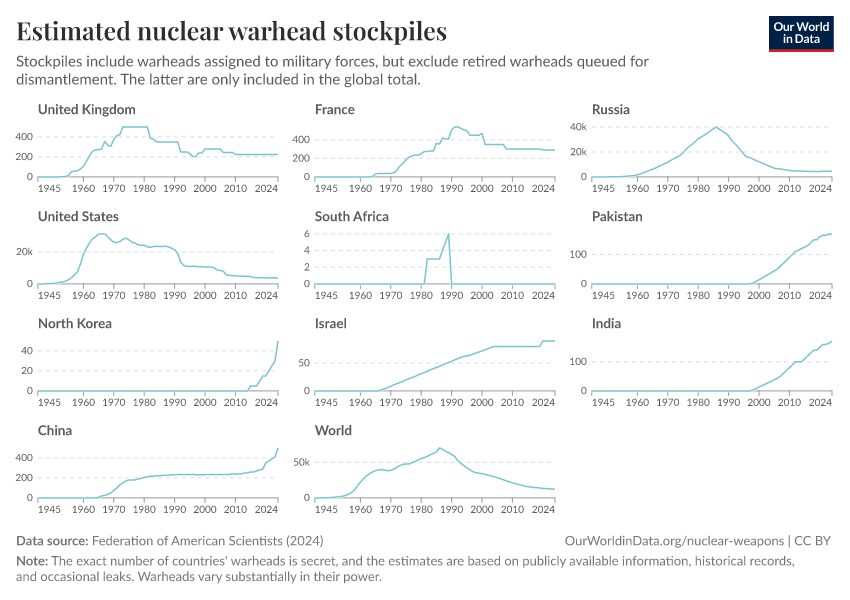 Federation of American Scientists (2024) – with minor processing by Our World in Data. “Estimated nuclear warhead stockpiles” [dataset]. Federation of American Scientists, “Estimated Global Nuclear Warhead Inventories” [original data]. Retrieved January 6, 2026 from https://sophia-test-2.owid.pages.dev/grapher/nuclear-warhead-stockpiles-lines