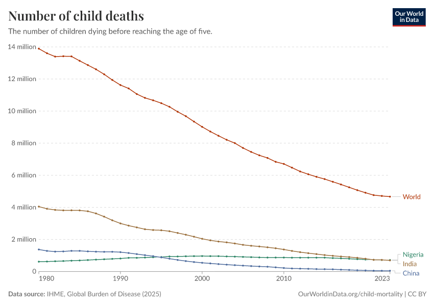 IHME, Global Burden of Disease (2024) – with minor processing by Our World in Data. “Number of child deaths” [dataset]. IHME, Global Burden of Disease, “Global Burden of Disease - Deaths and DALYs” [original data]. Retrieved January 6, 2026 from https://sophia-test-2.owid.pages.dev/grapher/number-of-child-deaths