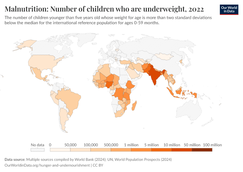 Multiple sources compiled by World Bank (2024); UN, World Population Prospects (2024) – processed by Our World in Data. “Number of underweight children – UN WPP” [dataset]. UNICEF, WHO, World Bank, “World Development Indicators”; United Nations, “World Population Prospects” [original data]. Retrieved January 6, 2026 from https://sophia-test-2.owid.pages.dev/grapher/number-of-children-who-are-underweight