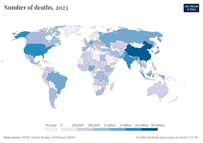 IHME, Global Burden of Disease (2024) – with minor processing by Our World in Data. “Number of deaths” [dataset]. IHME, Global Burden of Disease, “Global Burden of Disease - Deaths and DALYs” [original data]. Retrieved January 6, 2026 from https://sophia-test-2.owid.pages.dev/grapher/number-of-deaths-gbd