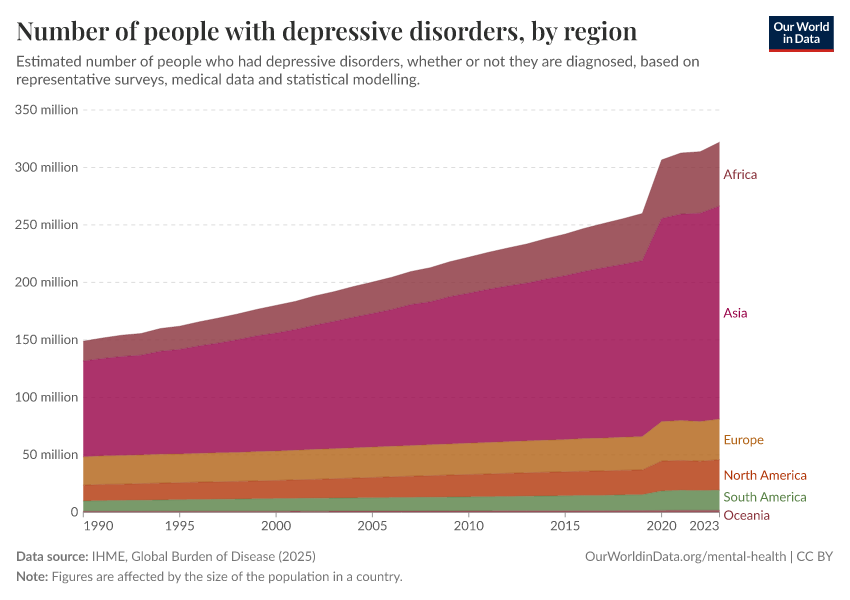 “Data Page: Number of people with depressive disorders, by region”, part of the following publication: Saloni Dattani, Lucas Rodés-Guirao, Hannah Ritchie, and Max Roser (2023) - “Mental Health”. Data adapted from IHME, Global Burden of Disease. Retrieved from https://sophia-test-2.owid.pages.dev/grapher/number-suffering-from-depression-by-region [online resource]How to cite this data