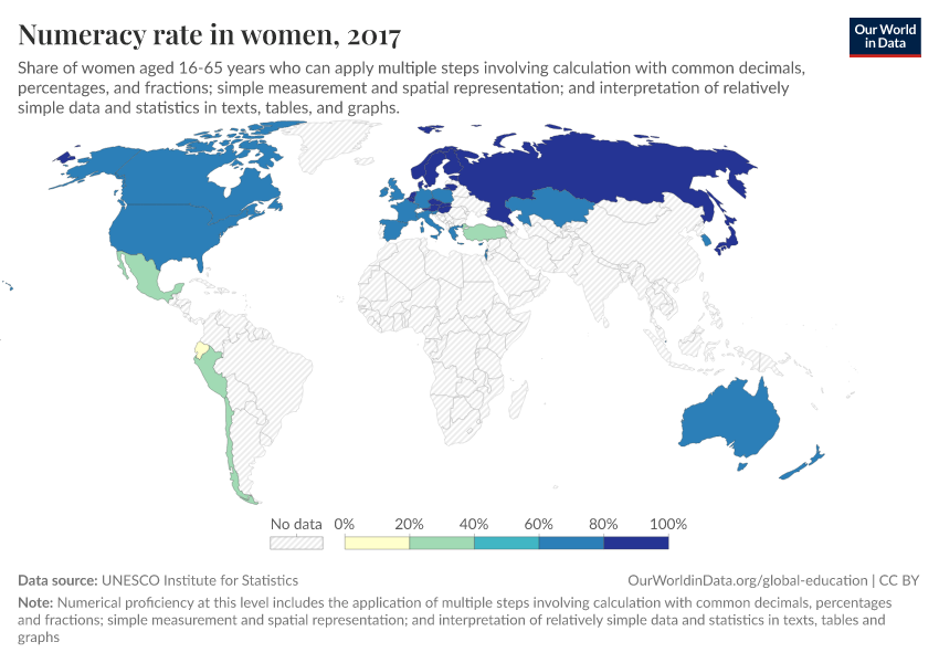 “Data Page: Numeracy rate in women”. Our World in Data (2026). Data adapted from UNESCO Institute for Statistics. Retrieved from https://sophia-test-2.owid.pages.dev/grapher/numeracy-rate-in-adult-women-sdg [online resource]How to cite this data
