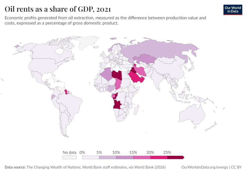 The Changing Wealth of Nations, World Bank staff estimates, via World Bank (2025) – processed by Our World in Data. “Oil rents as a share of GDP” [dataset]. The Changing Wealth of Nations, World Bank staff estimates, via World Bank, “World Development Indicators 122” [original data]. Retrieved January 6, 2026 from https://sophia-test-2.owid.pages.dev/grapher/oil-rents-as-a-share-of-gdp