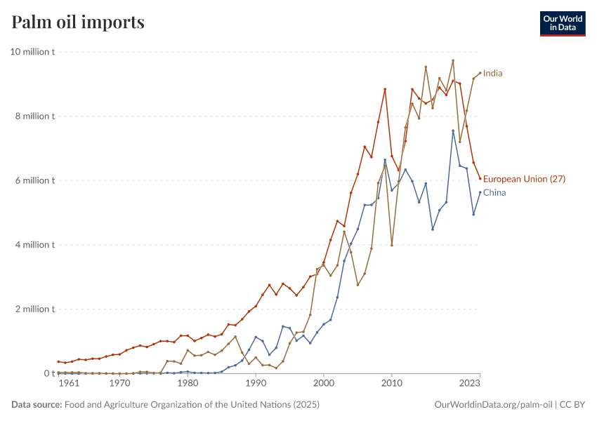 “Data Page: Imports of palm oil”. Our World in Data (2026). Data adapted from Food and Agriculture Organization of the United Nations. Retrieved from https://sophia-test-2.owid.pages.dev/grapher/palm-oil-imports [online resource]How to cite this data