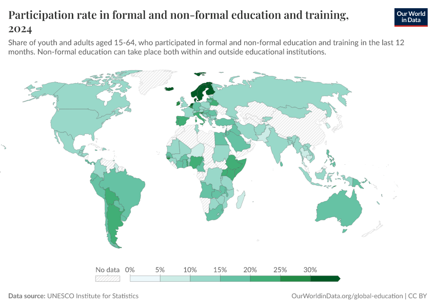 “Data Page: Participation rate in formal and non-formal education and training”. Our World in Data (2026). Data adapted from UNESCO Institute for Statistics. Retrieved from https://sophia-test-2.owid.pages.dev/grapher/participation-rate-in-formal-and-non-formal-education-and-training [online resource]How to cite this data