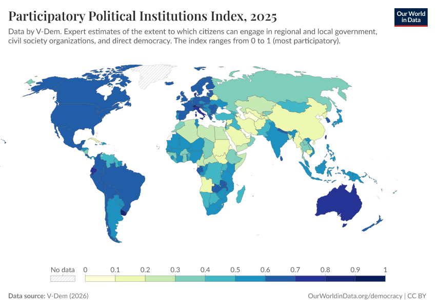 “Data Page: Participatory political institutions”, part of the following publication: Bastian Herre, Lucas Rodés-Guirao, and Esteban Ortiz-Ospina (2013) - “Democracy”. Data adapted from V-Dem. Retrieved from https://sophia-test-2.owid.pages.dev/grapher/participatory-political-institutions-index [online resource]How to cite this data