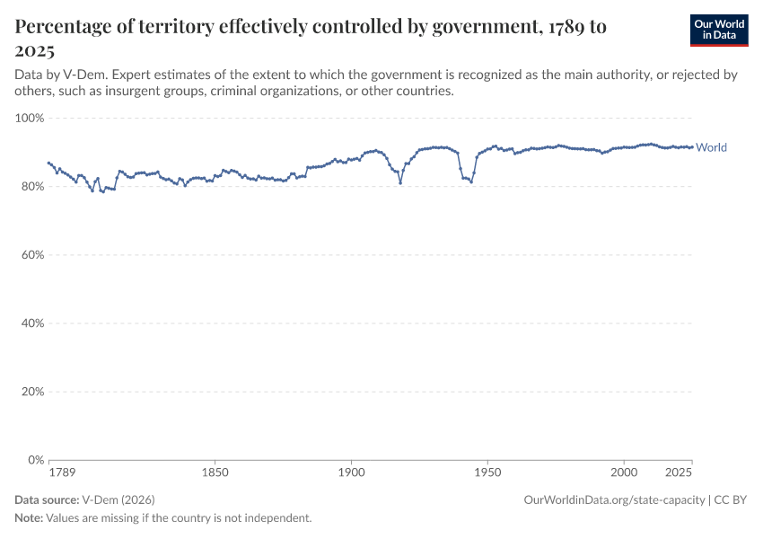 “Data Page: Territory under state control”, part of the following publication: Bastian Herre, Lucas Rodés-Guirao, and Esteban Ortiz-Ospina (2013) - “Democracy”. Data adapted from V-Dem. Retrieved from https://sophia-test-2.owid.pages.dev/grapher/percentage-of-territory-controlled-by-government [online resource]How to cite this data