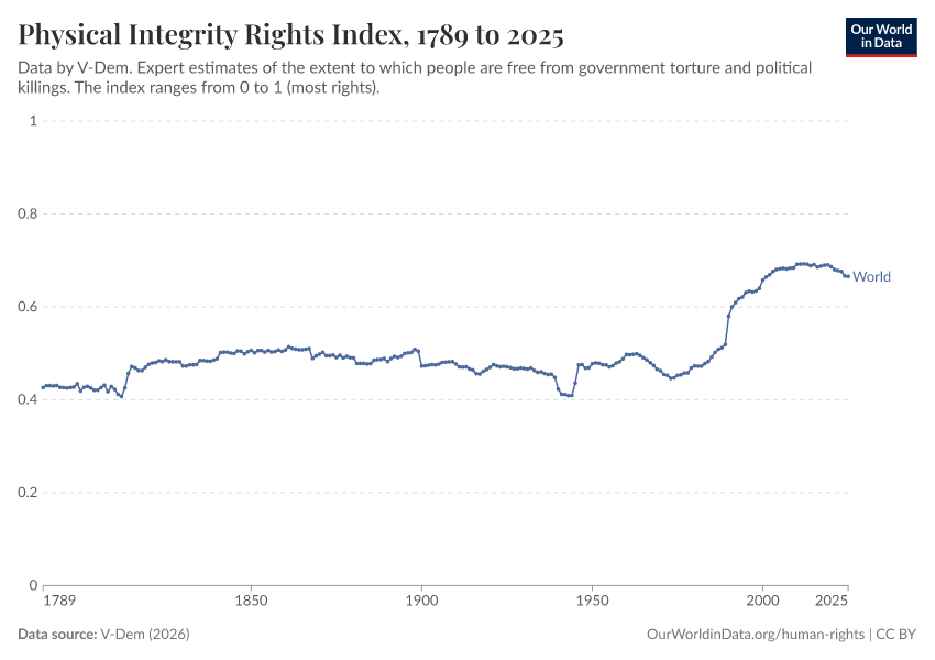 “Data Page: Physical violence index”, part of the following publication: Bastian Herre, Lucas Rodés-Guirao, and Esteban Ortiz-Ospina (2013) - “Democracy”. Data adapted from V-Dem. Retrieved from https://sophia-test-2.owid.pages.dev/grapher/physical-integrity-rights-index-vdem [online resource]How to cite this data
