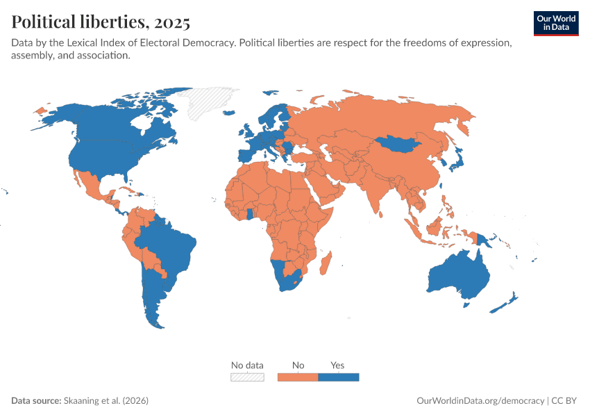 Skaaning et al. (2025) – processed by Our World in Data. “Political liberties” [dataset]. Skaaning et al., “Lexical Index of Electoral Democracy (LIED) v6.8” [original data]. Retrieved January 6, 2026 from https://sophia-test-2.owid.pages.dev/grapher/political-liberties-lexical