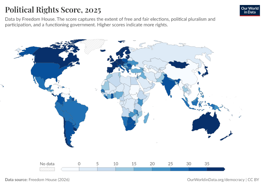 Freedom House (2025) – processed by Our World in Data. “Political rights score” [dataset]. Freedom House, “Freedom in the World” [original data]. Retrieved January 6, 2026 from https://sophia-test-2.owid.pages.dev/grapher/political-rights-score-fh