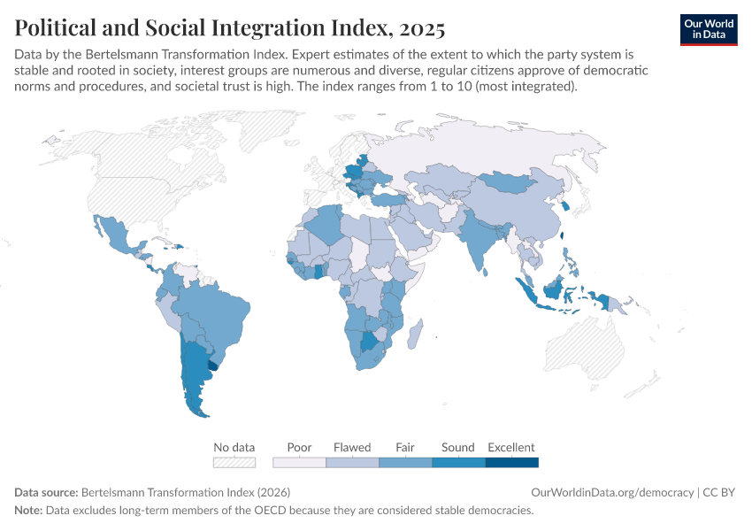 “Data Page: Political and Social Integration Index”, part of the following publication: Bastian Herre, Lucas Rodés-Guirao, and Esteban Ortiz-Ospina (2013) - “Democracy”. Data adapted from Bertelsmann Transformation Index. Retrieved from https://sophia-test-2.owid.pages.dev/grapher/political-social-integration-index-bti [online resource]How to cite this data