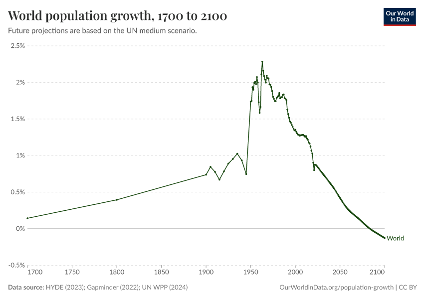 “Data Page: World population growth”, part of the following publication: Hannah Ritchie, Lucas Rodés-Guirao, Edouard Mathieu, Marcel Gerber, Esteban Ortiz-Ospina, Joe Hasell, and Max Roser (2023) - “Population Growth”. Data adapted from PBL Netherlands Environmental Assessment Agency, Gapminder, United Nations. Retrieved from https://sophia-test-2.owid.pages.dev/grapher/population-growth-rate [online resource]How to cite this data