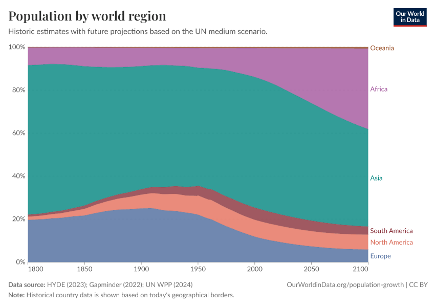“Data Page: Population by world region”, part of the following publication: Hannah Ritchie, Lucas Rodés-Guirao, Edouard Mathieu, Marcel Gerber, Esteban Ortiz-Ospina, Joe Hasell, and Max Roser (2023) - “Population Growth”. Data adapted from PBL Netherlands Environmental Assessment Agency, Gapminder, United Nations. Retrieved from https://sophia-test-2.owid.pages.dev/grapher/population-regions-with-projections [online resource]How to cite this data