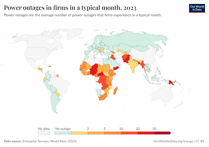 “Data Page: Power outages in firms in a typical month”. Our World in Data (2026). Data adapted from Enterprise Surveys, World Bank. Retrieved from https://sophia-test-2.owid.pages.dev/grapher/power-outages-in-firms-per-month [online resource]