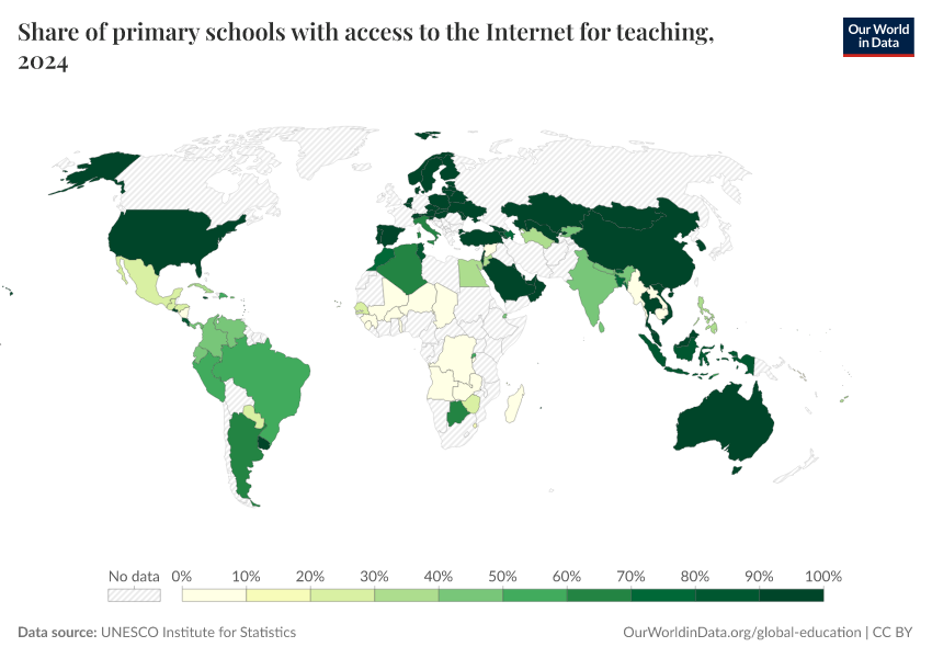 UNESCO Institute for Statistics – processed by Our World in Data. “Share of primary schools with access to the Internet for teaching” [dataset]. UNESCO Institute for Statistics, “Data from multiple sources” [original data]. Retrieved January 6, 2026 from https://sophia-test-2.owid.pages.dev/grapher/primary-schools-with-access-to-internet