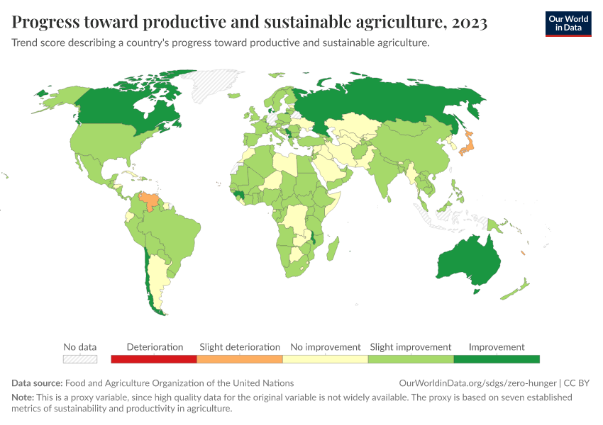 “Data Page: Progress toward productive and sustainable agriculture”. Our World in Data (2026). Data adapted from Food and Agriculture Organization of the United Nations. Retrieved from https://sophia-test-2.owid.pages.dev/grapher/progress-toward-productive-and-sustainable-agriculture [online resource]How to cite this data