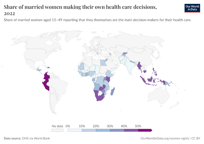 “Data Page: Share of married women making their own health care decisions”, part of the following publication: Bastian Herre, Veronika Samborska, Pablo Arriagada, and Hannah Ritchie (2023) - “Women’s Rights”. Data adapted from World Bank Gender Statistics. Retrieved from https://sophia-test-2.owid.pages.dev/grapher/proportion-of-women-who-make-their-own-informed-health-care-decisions [online resource]How to cite this data