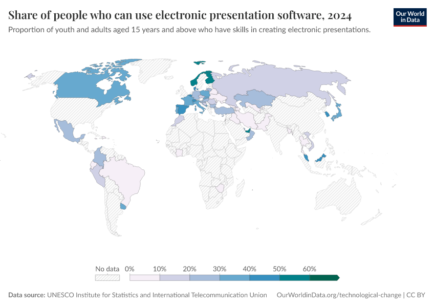 “Data Page: Share of people who can use electronic presentation software”. Our World in Data (2026). Data adapted from UNESCO Institute for Statistics and International Telecommunication Union. Retrieved from https://sophia-test-2.owid.pages.dev/grapher/proportion-with-ict-skills-in-presentations [online resource]How to cite this data