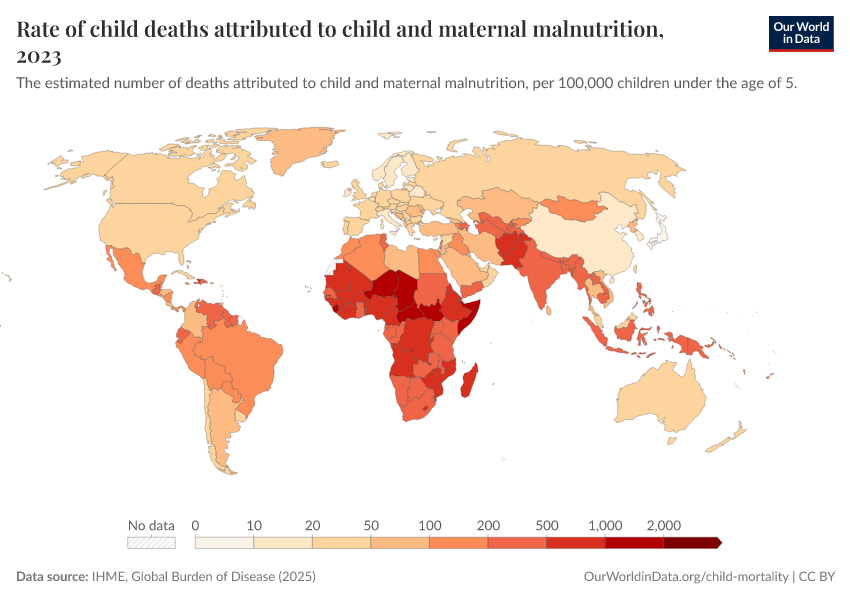 “Data Page: Rate of child deaths attributed to child and maternal malnutrition”, part of the following publication: Esteban Ortiz-Ospina and Max Roser (2016) - “Global Health”. Data adapted from IHME, Global Burden of Disease. Retrieved from https://sophia-test-2.owid.pages.dev/grapher/rate-of-child-deaths-attributed-to-child-and-maternal-malnutrition [online resource]How to cite this data