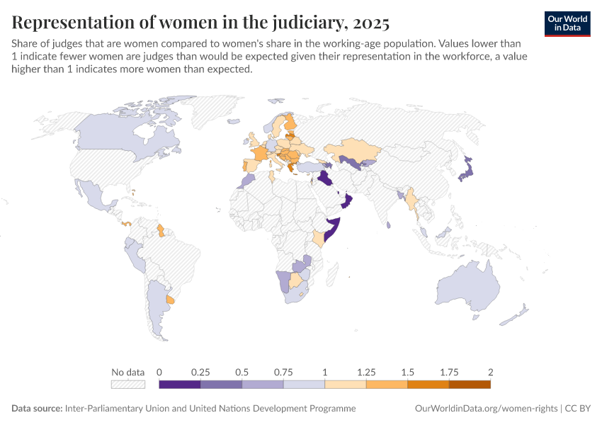 “Data Page: Representation of women in the judiciary”. Our World in Data (2026). Data adapted from Inter-Parliamentary Union and United Nations Development Programme. Retrieved from https://sophia-test-2.owid.pages.dev/grapher/representation-of-women-in-the-judiciary [online resource]How to cite this data