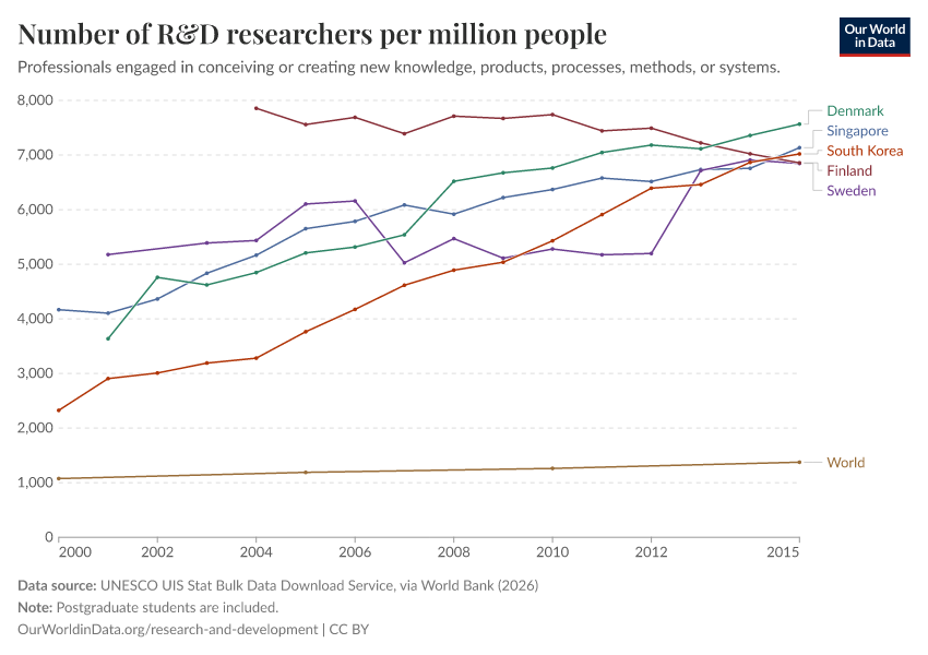 “Data Page: Number of R&D researchers per million people”. Our World in Data (2026). Data adapted from UNESCO UIS Stat Bulk Data Download Service, via World Bank. Retrieved from https://sophia-test-2.owid.pages.dev/grapher/researchers-in-rd-per-million-people [online resource]