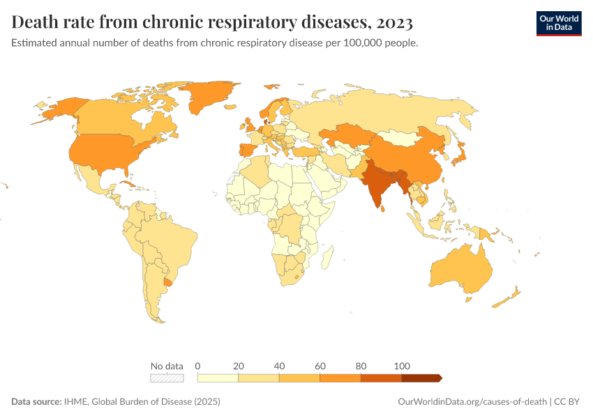 “Data Page: Death rate from chronic respiratory diseases”, part of the following publication: Esteban Ortiz-Ospina and Max Roser (2016) - “Global Health”. Data adapted from IHME, Global Burden of Disease. Retrieved from https://sophia-test-2.owid.pages.dev/grapher/respiratory-disease-death-rate-gbd [online resource]How to cite this data
